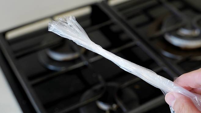 그리고 이렇게 자른 곳에 각종 조미료를 넣어 윗부분을 잘 묶어 주세요. 이렇게 하면 손쉽게 조미료를 조금씩 옮겨 담을 수 있어 여행 갈 때 참 유용해요.