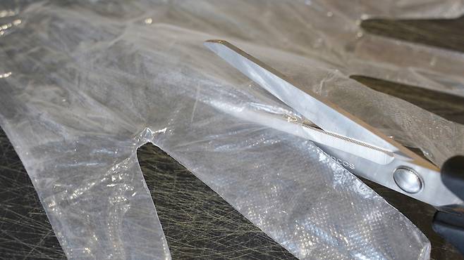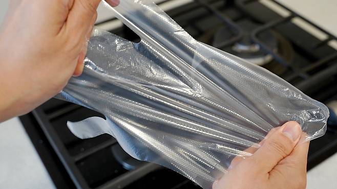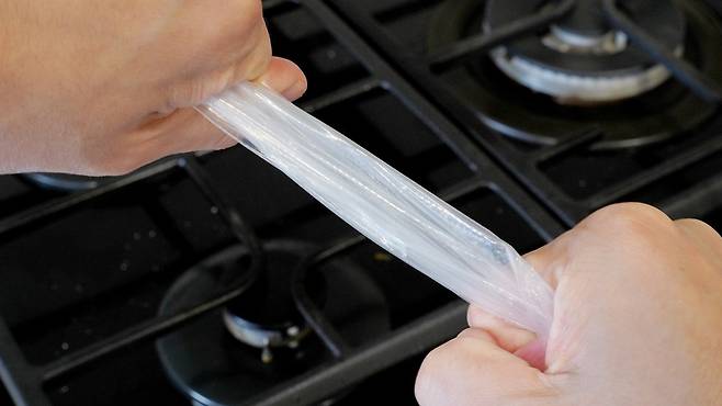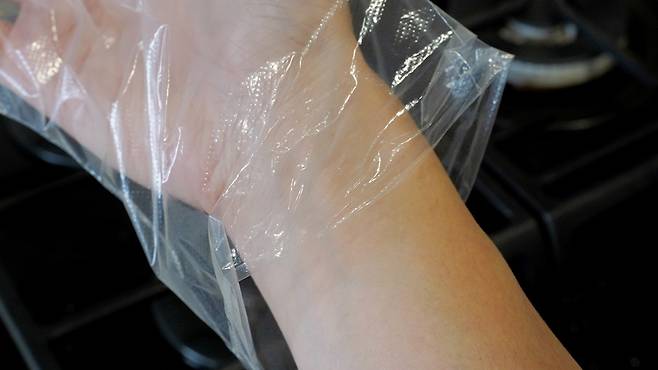 이럴 땐 비닐장갑 손목 부분을 잡은 후 쭉 늘려 사용하면 아주 손쉽게 해결이 된답니다. 손목 끝 부분을 양손으로 잡고 최대한 늘릴 수 있도록 해주세요. 너무 세게 잡아당기면 찢어질 수 있으니 힘을 잘 조절하세요.