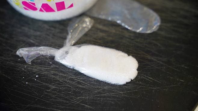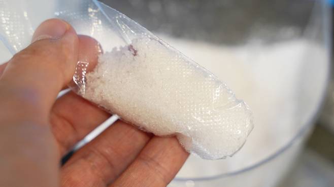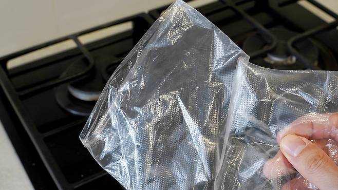 그리고 이렇게 자른 곳에 각종 조미료를 넣어 윗부분을 잘 묶어 주세요. 이렇게 하면 손쉽게 조미료를 조금씩 옮겨 담을 수 있어 여행 갈 때 참 유용해요.
