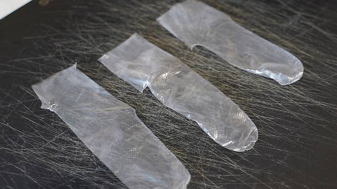 장갑을 사용하고 빼려고 하면 안에 습기가 차기 때문에 보통 쉽지 않은데요. 그래서 뒷부분을 잡고 벗겨 버리면, 다시 사용하기 정말 어려워요.