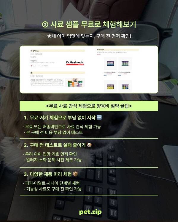 가까운 반려동물 용품점이 유인으로 운영되고 있다면, 기존에 먹던 사료를 구입하며 조심스레 샘플의 유무를 여쭤보는 것도 좋습니다.
