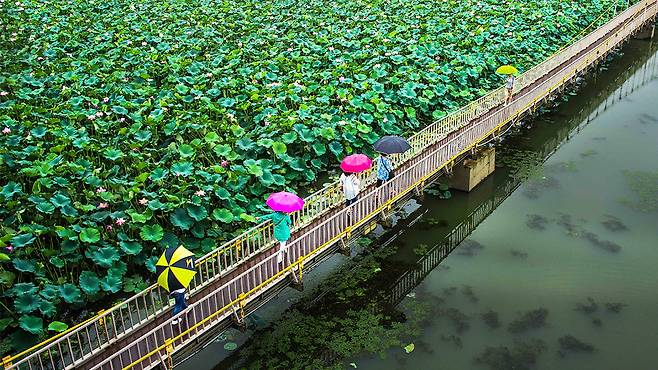 연꽃이 흐드러지게 핀 호수를 가로지르며 정자와 정자를 잇는 이 다리는, 전통 담장을 따라 조성된 산책로로 탈바꿈해 걸음마다 여유가 느껴진다.