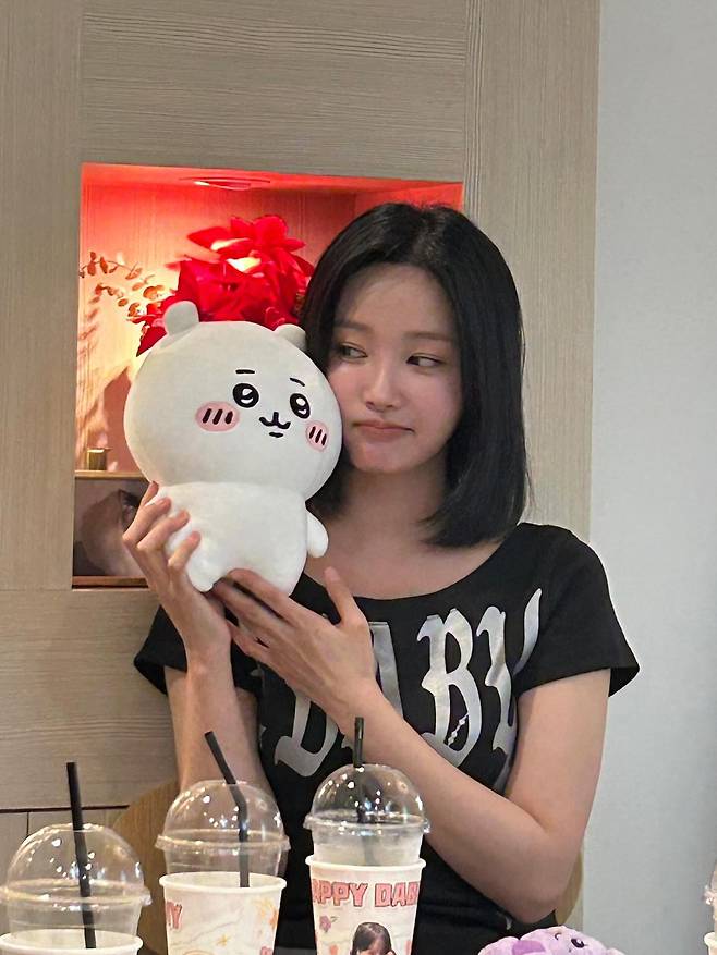 다른 컷에서는 프린트 티셔츠에 캐릭터 인형을 들고 있는 모습이 포착됐어요.