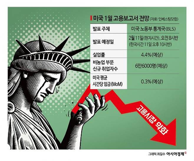 11일(현지시간) 발표될 예정인 미국 1월 고용보고서를 두고 전 세계 금융계가 긴장하고 있다. 노동시장의 향방은 미 연방준비제도(Fed)의 금리 노선을 바꿀 수도 있는 동인으로 작용한다. 시장에서는 고용 지표가 악화될 것으로 보고 있는데, 이는 금리 인하 가능성을 높이는 재료로 활용될 수 있다.