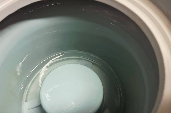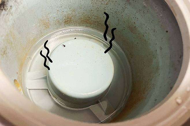 그다음 전기포트로 팔팔 끓인 뜨거운 물을 천천히 부어주세요. 미지근한 물이 아닌 뜨거운 물이 효과가 좋아요.