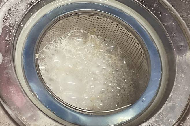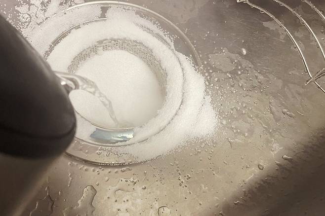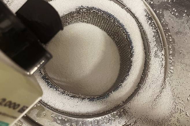 먼저 할 일은 배수구에 물이 빠져나가지 않도록 배수구 구멍에 비닐봉지를 넣어 막아주세요. 그다음 과탄산소다를 넉넉히 뿌려주세요.