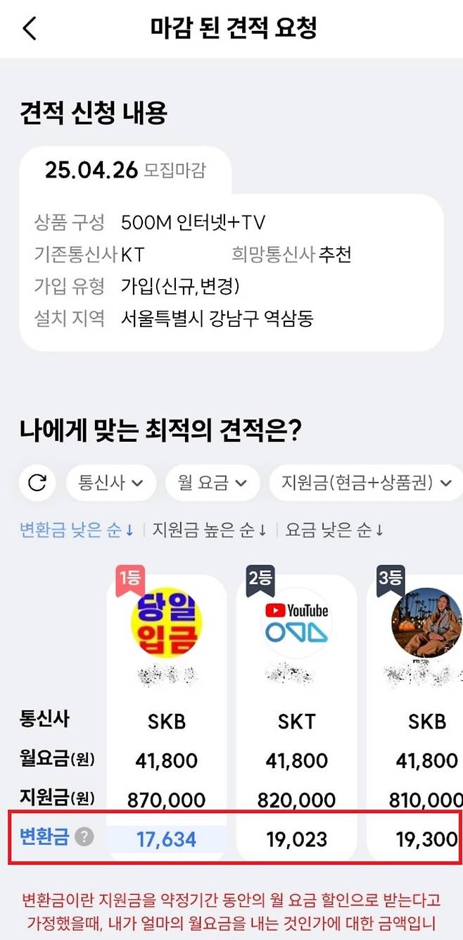 하지만 퍼스플러스는 간단하다. 아래 이미지에서 빨간 네모를 친 ‘변환금’은 실제 월 인터넷 사용비다. 즉 월 요금에서 (지원비/36개월)을 뺀 금액이다. 이것만으로 어디가 가장 저렴한지 한눈에 바로 알 수 있다. 더는 어디가 싼지 헤맬 필요가 없다.