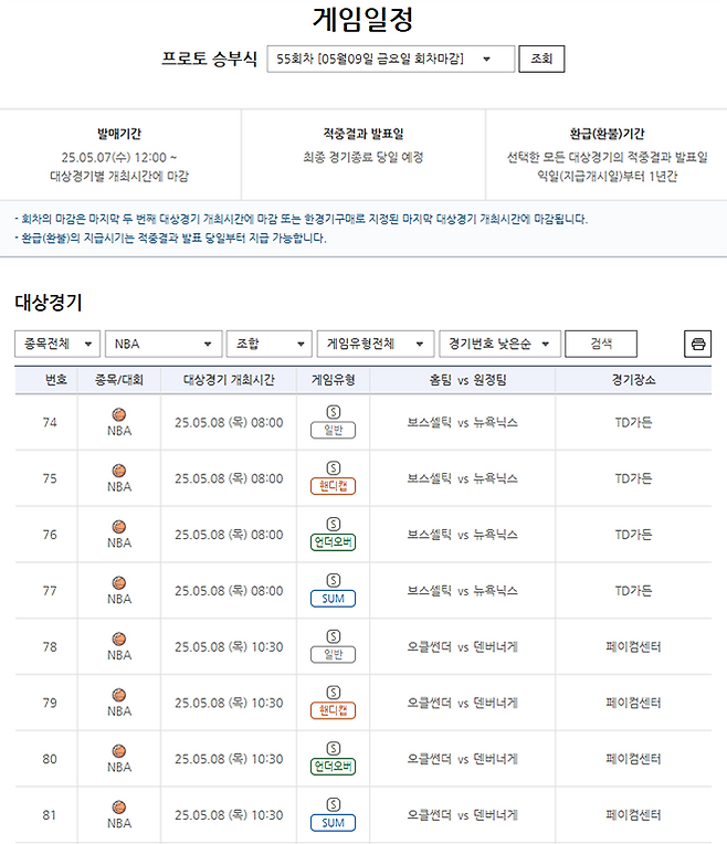 NBA 플레이오프 보스턴-뉴욕 및 오클라호마-덴버 2차전 대상 프로토 승부식 55회차 발매