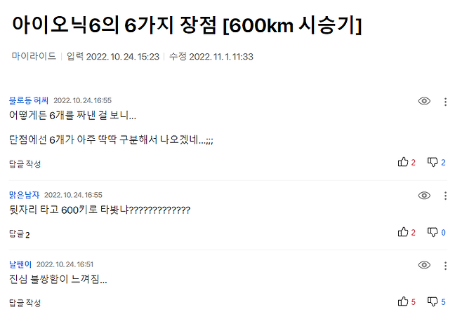 올 것이 왔습니다 . 지난 아이오닉6 600km 주행기 [희망편] , 아이오닉 6의 6가지 장점에 대해 많은 독자분들께서 '애썼다'는 따뜻한 독려(?)의 말씀을 전해주셨습니다. 뜨거운 성원에 힘입어 올 것이 왔습니다. 아이오닉6 시승기 2, 오늘은 6가지 단점 에 대해 이야기해보겠습니다.