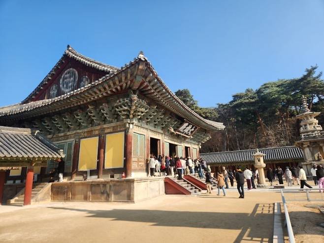 | ▲ 석가모니 부처님을 모신 불국사의 중심 법당 대웅전. 화려한 다포 양식의 지붕과 당당한 건축미가 돋보인다. |