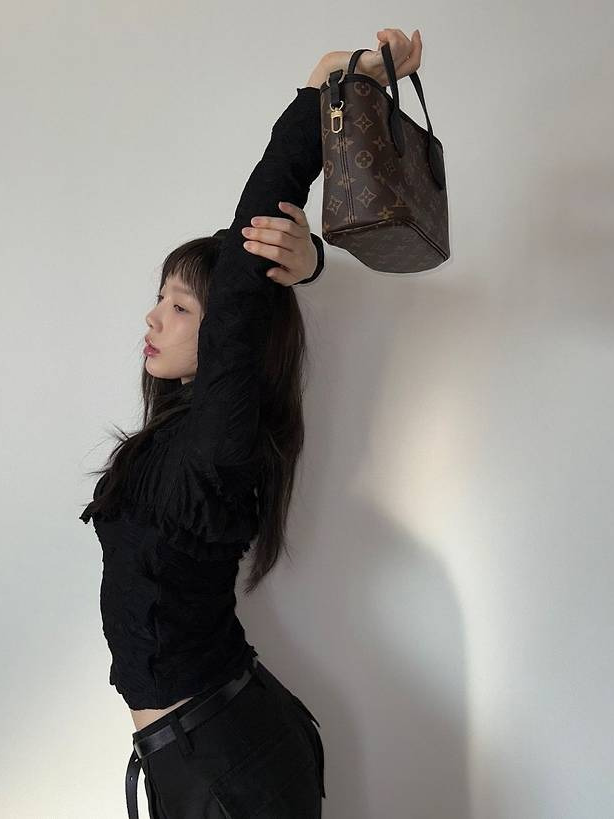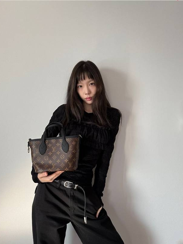 태연은 블랙 컬러의 셔링 티셔츠와 카고 팬츠를 매치하여 모던한 무드를 강조했으며, 여기에 클래식한 모노그램 핸드백으로 스타일의 완성도를 더했습니다.