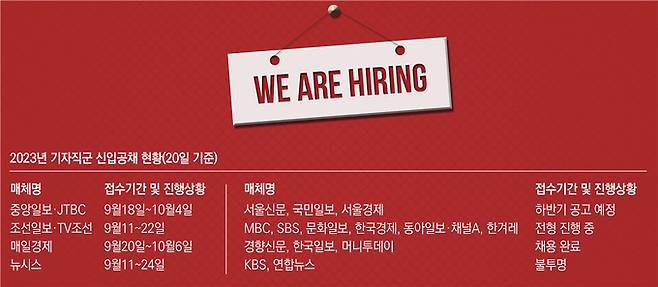 중앙그룹은 최근 ‘2023 신입사원 공채 실시’ 공고로 9월18일~10월4일 접수를 마감하는 6개 계열사 채용 사실을 알렸다. 이에 따라 중앙일보에선 취재기자, JTBC에선 취재기자, 예능PD, 아나운서, 편성, 재무 인력을 뽑는다. SLL에선 기획과 제작을 맡을 드라마PD를 채용한다. 조선일보와 TV조선도 앞서 9월11~22일 지원을 받는 신입채용 공고를 냈다. 신문기자와 방송기자, 신문/방송기자(회사 판단으로 배치)를 채용하고, 미디어경영직과 제작PD(예능)도 뽑는다. 채용규모에 대해 양사는 “답변이 어렵다”고 했다. 매일경제도 9월20일~10월6일을 접수기간으로 하는 수습기자 모집 사고를 20일 냈다. 앞서 뉴시스가 수습기자 O명(접수 9월11~24일)을 뽑는다고 밝혔고, 아주미디어그룹도 계열사 이코노믹데일리, 아주일보, 아주프레스, 아주로앤피의 취재기자 등을 채용(접수 9월11~22일)한다고 알린 바 있다. 코리아타임스(신입·경력 편집기자), 강원일보, 광주매일신문도 현재 공고가 나와 있다.