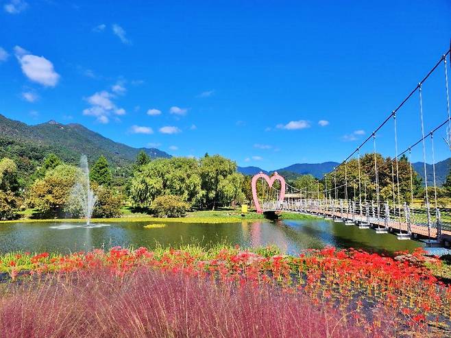 산책길 곳곳에는 하동의 상징이 된 하트 모양 출렁다리가 놓여 있고, ‘천국의 계단’, 나룻배, 작은 정자 등 감성적인 포토존이 마련되어 있어 여행객들의 발길이 잦다.