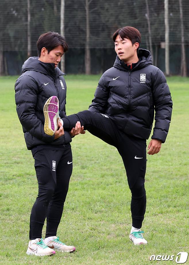 (라 플라타(아르헨티나)=뉴스1) 이승배 기자 = 한국 20세 이하(U-20) 월드컵 축구대표팀 이승원과 강상윤이 7일(현지시간) 아르헨티나 라 플라타 하워드 존슨 호텔 인근 훈련장에서 회복훈련에 임하고 있다. 2023.6.7/뉴스1
