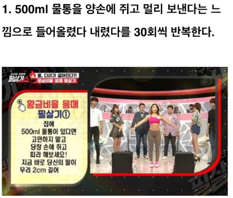 팔길이는 타고나는 것이라 생각하는 사람들이 많겠지만 뭐든 피나는 노력을 하면 우리 체형은 바뀔 수 있습니다. 그리고 바뀔 수 있다는 생각을 해야 진짜 바뀌는 것이고요. 위에 방법은 숨어있는 팔길이를 뽑아내는 동작입니다.