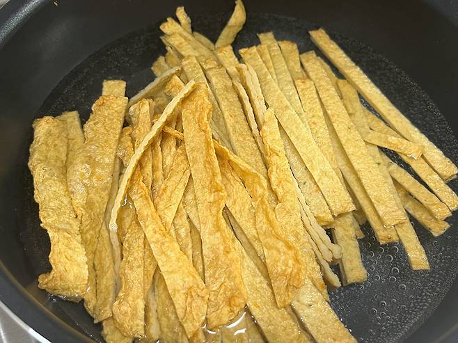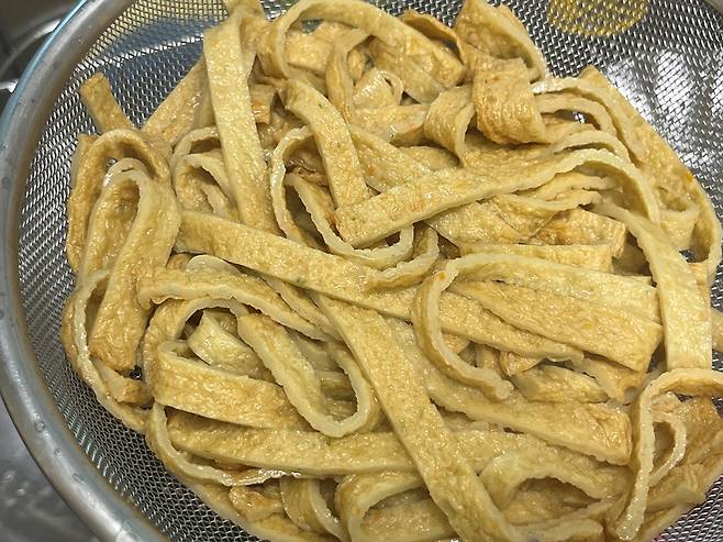 데친 어묵은 체에 밭쳐 물기를 빼세요. 또한 어묵은 제조 과정에서 기름에 튀겨져 나오기 때문에 그대로 조리하면 느끼하고 잡내가 남을 수 있습니다. 이때 끓는 물에 가볍게 데쳐내면 기름기가 빠져 훨씬 깔끔한 맛을 낼 수 있고, 양념도 더 잘 배어듭니다.