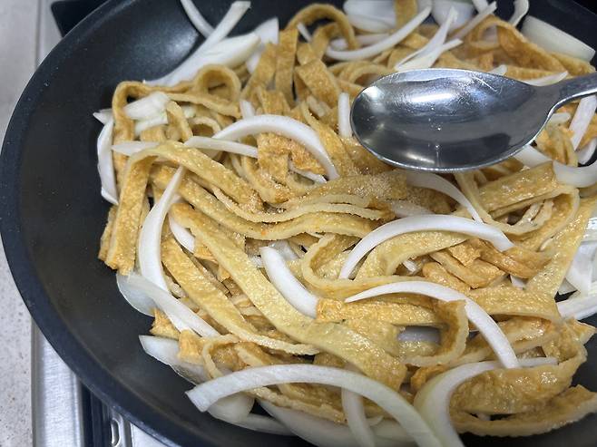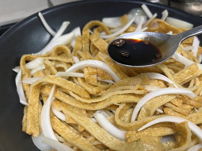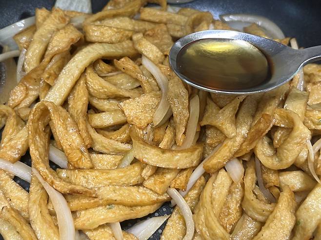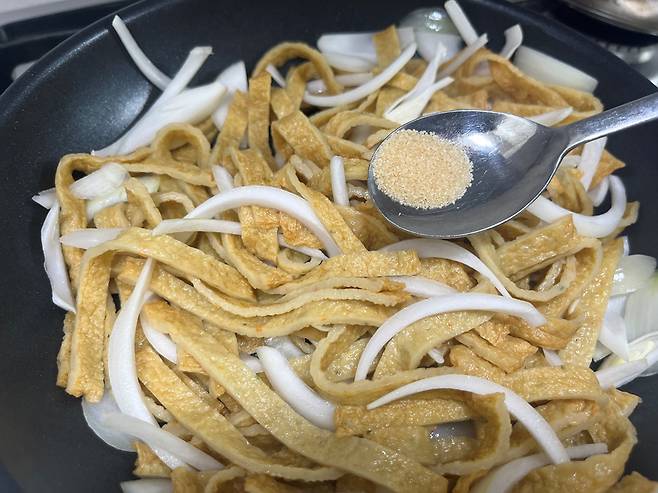 그리고 맛술 1스푼 넣습니다. 맛술은 잡내를 없애고 감칠맛을 더해주는 역할을 합니다. 어묵 특유의 비린내나 기름 냄새가 깔끔하게 사라지면서, 한층 깔끔한 맛이 됩니다.