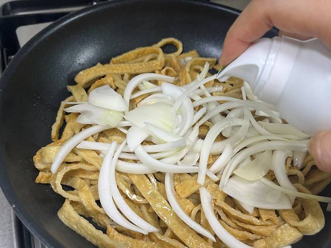 어묵을 팬에 넣고 양파도 함께 넣습니다. 야채는 당근, 파프리카 등 냉장고에 있는 채소를 얼마든 활용하면 됩니다. 기름은 소량만 뿌려 주세요.