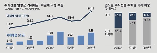 시가총액과 비슷한 개념인 주식선물의 미결제약정 수량은 처음으로 1000만계약을 돌파했다. 기관과 외국인의 거래 비중이 크게 늘어나며 전문투자자 위주의 성숙한 시장으로 성장했다는 평가다.