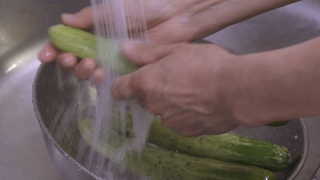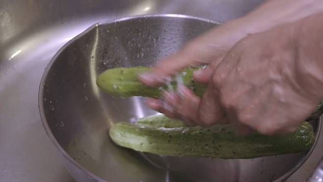 오이를 물에 한번 묻히세요. 굵은소금으로 겉표면을 한번 닦아 주세요. 그리고 물에 깨끗이 씻어 주세요.