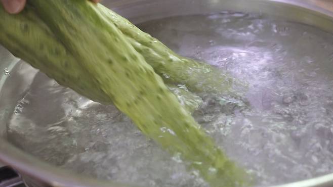 끓는 물에 오이를 넣고 10초간 데쳐 주세요. 바로 찬물에 씻어 식혀 주세요. '이과정'을 거치고 난 오이는 더욱 아작아작 맛있게 즐길 수 있어요. 이렇게 데치고 난 오이는 무르지 않고 먹는 끝까지 아작하게 즐길 수 있어 좋답니다.