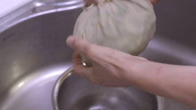 베보자기를 물에 한번 적신 후, 오이 물기를 꼭~ 짜주세요. 물에 한번 적셔야 더욱 쉽게 오이를 짤 수 있어요.