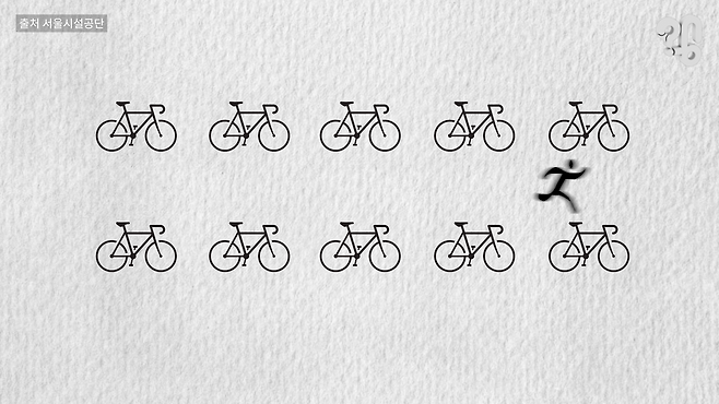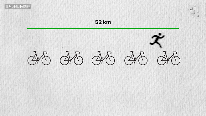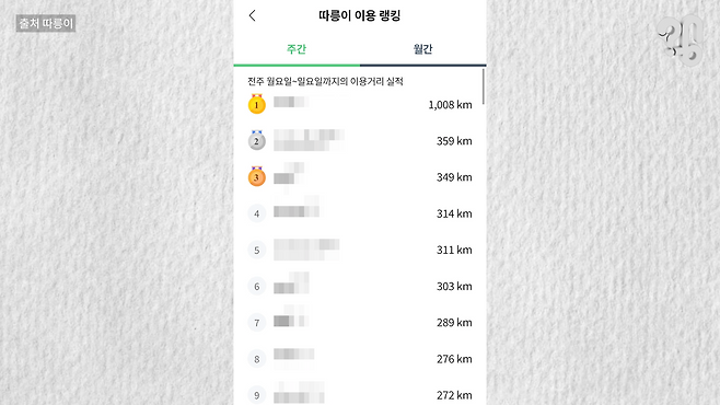 어쨌든 이용객 수가 가장 높은 따릉이만 놓고 보면 주간랭킹 1위의 총 거리는 1008㎞. 하루평균 144㎞로 서울 여의도에서 출발해 경기도 성남을 지나 이천까지를 매일 왕복하는 거리다. 따릉이 관리를 맡고 있는 서울시설공단에 물어봤더니, 주간 랭킹에는 GPS 기계 오류 때문에 허수가 어느 정도 들어갈 수 있다는 답변을 받았다.