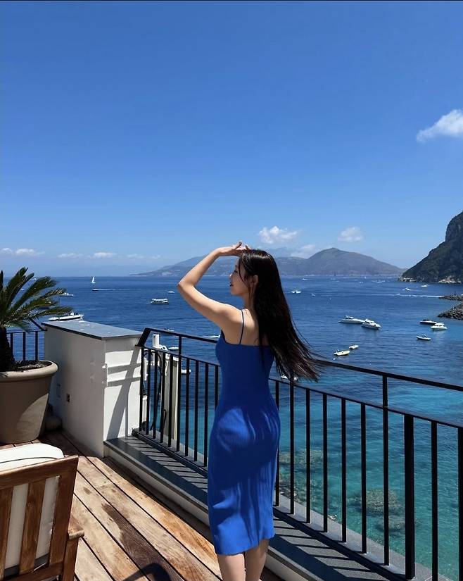 어깨라인과 허리선이 강조되는 디자인으로 절제된 섹시미와 단정함을 동시에 담아낸 이 룩은, 바다와 절묘하게 어우러지며 그림 같은 장면을 완성했습니다.