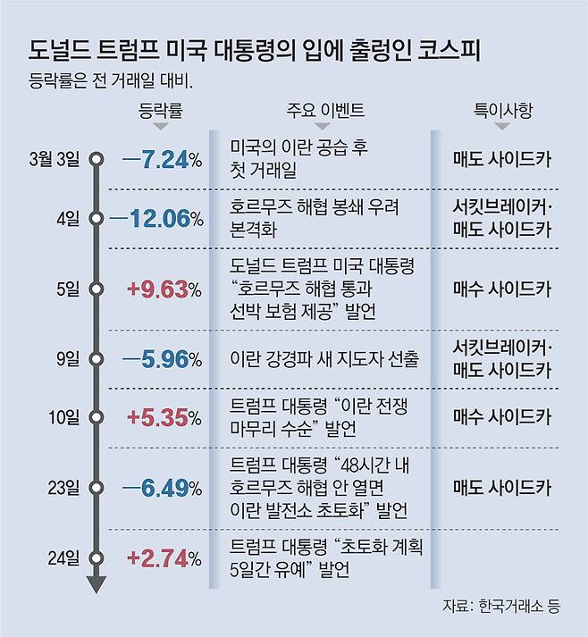 코스피는 이달 들어 글로벌 금융위기 이후 가장 큰 변동성을 보이고 있다. 서킷 브레이커(매매 일시 중단)가 2회 발동됐고, 사이드카(프로그램 호가 일시 효력 정지)는 매도와 매수를 합쳐 7회 발동됐다. 올해 누적으론 사이드카가 10회 발동됐는데 이는 연간 기준으로 2008년(26회) 다음으로 많다. 올해가 3개월이 채 지나기도 전에 역대 두 번째 기록을 세운 셈이다. 미국이 이란에 대한 공습을 예고하고 이란이 강경하게 맞서면 증시가 급락했다가, 트럼프 대통령이 조기 종전을 시사하면 증시가 반등하는 상황이 반복되고 있다.