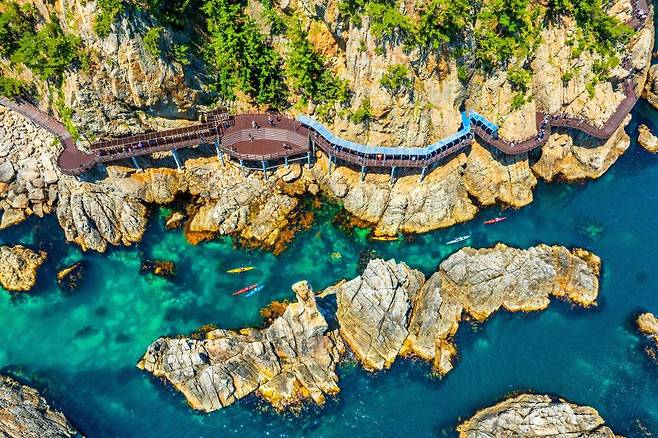 60여 년간 군사 통제구역이었던 동해안의 해변을 따라 기암괴석과 푸른 바다가 함께 만들어 낸 660m의 무장애 데크 길입니다. 특히 촛대바위와 용굴 등 신비한 침식 지형과 바위들을 코 앞에서 관찰할 수 있죠.