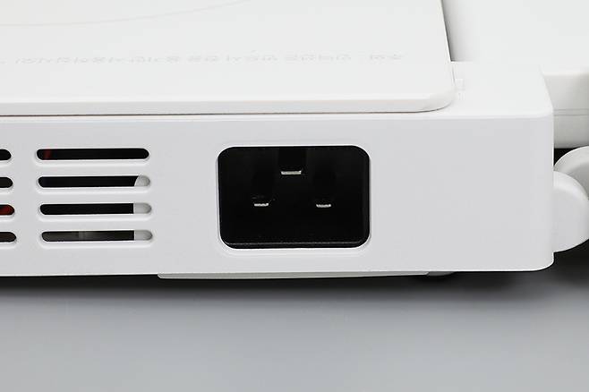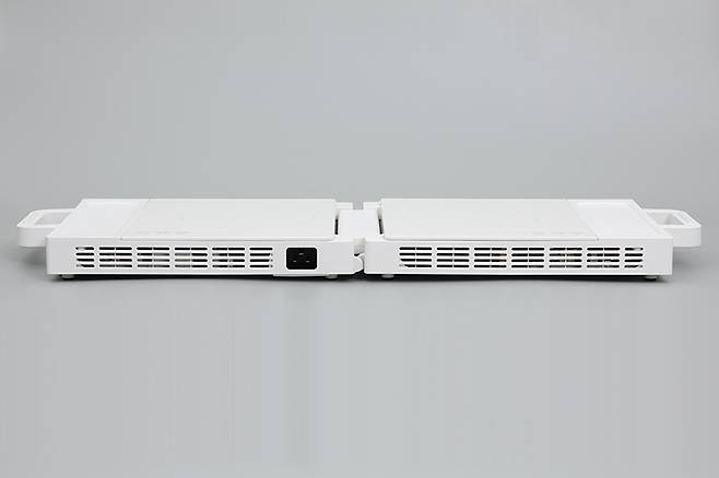 펼친 상태에서 뒷면을 보면 대부분의 공간이 공기가 드나들 수 있는 송풍구로 이루어져 있으며, 한쪽 끝에만 전원 코드를 연결하는 단자가 위치해 있다.