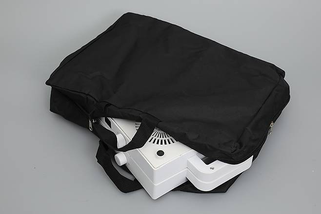 박스에서 꺼낸 본체는 마치 플라스틱 소재의 가방처럼 보이는데, 윗면에 원형의 타공된 부위가 있어서 팬이 내장된 곳임을 짐작할 수 있다.