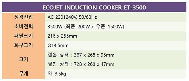 최근 1~2인 가구와 캠핑·차박 인구가 늘면서 빌트인 설치 없이 바로 사용할 수 있는 휴대용 인덕션 제품이 주목받고 있다. 슬림한 디자인과 간편한 이동성, 그리고 다양한 조리 환경에 대응하는 출력 조절 기능까지 요구가 높아지는 추세다. 에코제트가 선보인 2구 접이식 인덕션 ET-3500은 본체를 반으로 접어 보관과 이동이 가능한 폴더블 구조를 채택해, 공간 활용과 휴대성을 모두 고려한 제품이다.