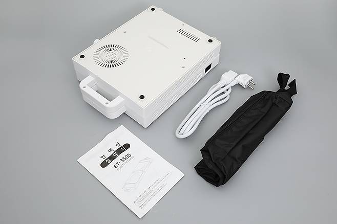 구성품으로는 에코제트 2구 접이식 인덕션 ET-3500 본체와 전원 코드, 휴대용 가방, 그리고 사용 설명서가 기본 제공된다.