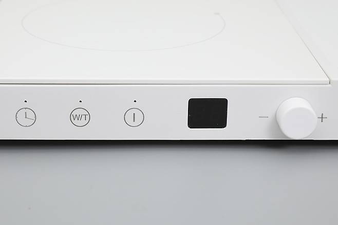 조작부는 다이얼과 전원 버튼, 출력/온도 선택 버튼, 타이머 버튼으로 이루어져 있으며, 다이얼과 전원 버튼 사이에는 표시창이 자리잡고 있다.