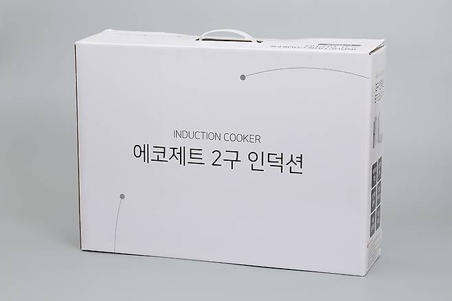 에코제트 2구 접이식 인덕션 ET-3500은 갈색 골판지 박스 안에 흰색 박스가 또 들어있는 이중 박스 포장을 사용하고 있다.