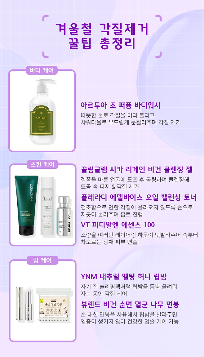 바디, 스킨, 립 이렇게 세 분류로 나누어 에디터의 각질제거 꿀팁을 간단하게 요약해보았다.