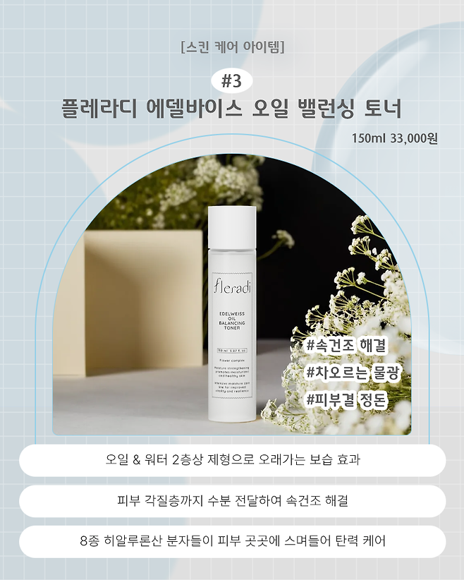하지만 플레라디의 에델바이스 오일 밸런싱 토너는 오일과 워터를 섞어 사용하는 제품으로, 플레라디만의 독자적 기술과 식물성 오일 성분 덕분에 수분을 피부 깊은 속까지 전달하도록 도와주고, 수분 증발을 억제해 오랫동안 보습효과가 유지될 수 있도록 도와준다.