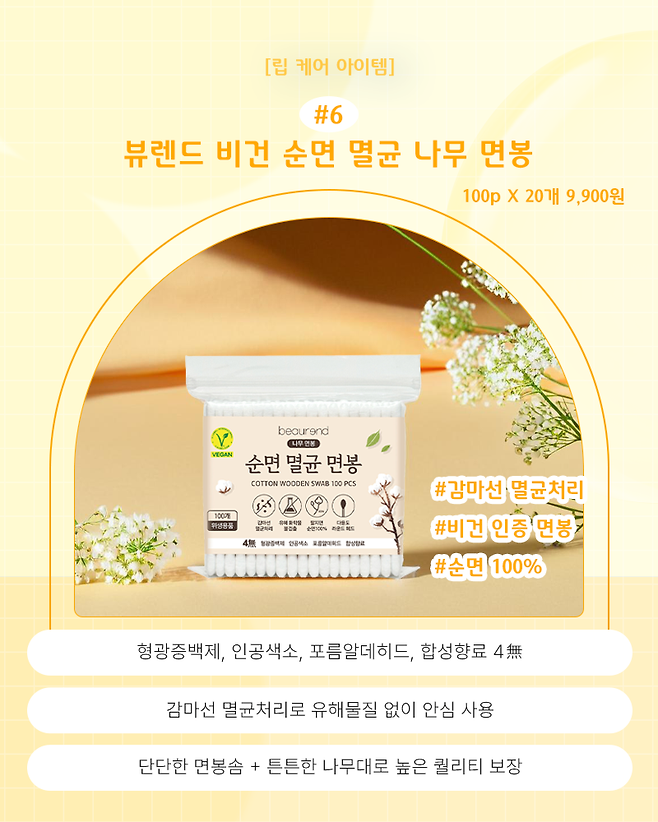 또한 유해 물질이나 세균 등이 없는 안심 비건 면봉이기 때문에 상처난 부위에 연고를 바르거나, 입술처럼 민감한 부위에 립밤을 바를 때 활용하기에도 좋은 화장품 추천 아이템이다.