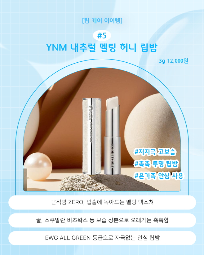 다섯 번째로 입술 건조와 각질에 정말 고민이 많은 에디터가 적극 추천하는 YNM 내추럴 멜팅 허니 립밤이다.