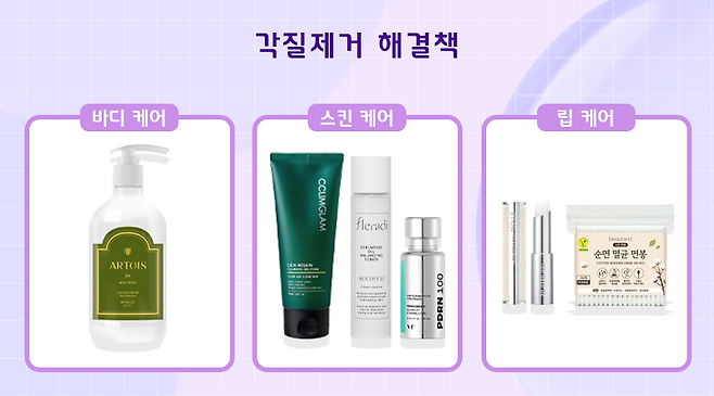 크게 바디케어, 스킨케어, 립케어로 나누어 각질제거 관리를 진행하고 있고,별도의 각질제거제는 사용하지 않는다.