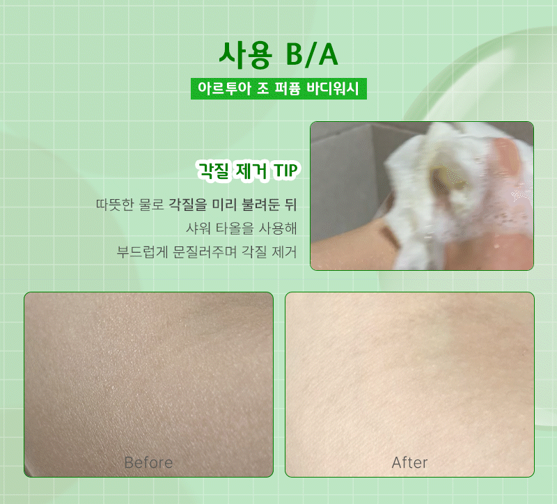 2주간 다른 바디워시를 사용하면서 각질이 일어나는 건 물론이고 뱀살처럼 살결이 쩍쩍 갈라진 것처럼 수분감이 부족했는데, 다시 1주간 아르투아 조 퍼퓸 바디워시를 사용한 후에는 각질도 자연스럽게 줄어들고 뱀살에서 부드러운 아기피부로 재탄생하였다.
