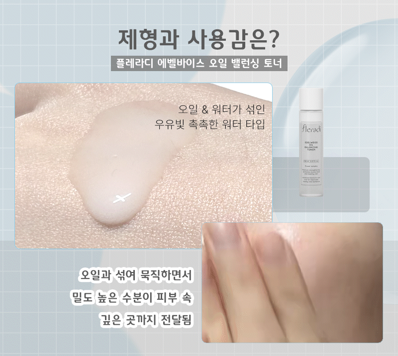 하지만 플레라디의 에델바이스 오일 밸런싱 토너는 오일과 워터를 섞어 사용하는 제품으로, 플레라디만의 독자적 기술과 식물성 오일 성분 덕분에 수분을 피부 깊은 속까지 전달하도록 도와주고, 수분 증발을 억제해 오랫동안 보습효과가 유지될 수 있도록 도와준다.