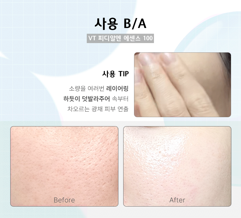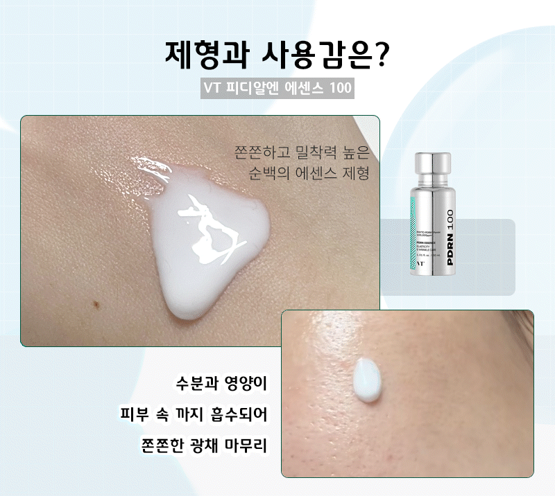 에디터가 VT 피디알엔 에센스 100을 꾸준히 사용하는 이유 중 하나로, 피부 깊숙한 곳까지 제품이 아주 쫀쫀하게 흡수되기 때문에 꾸준히 사용하면 개선효과가 매우 뛰어나다.