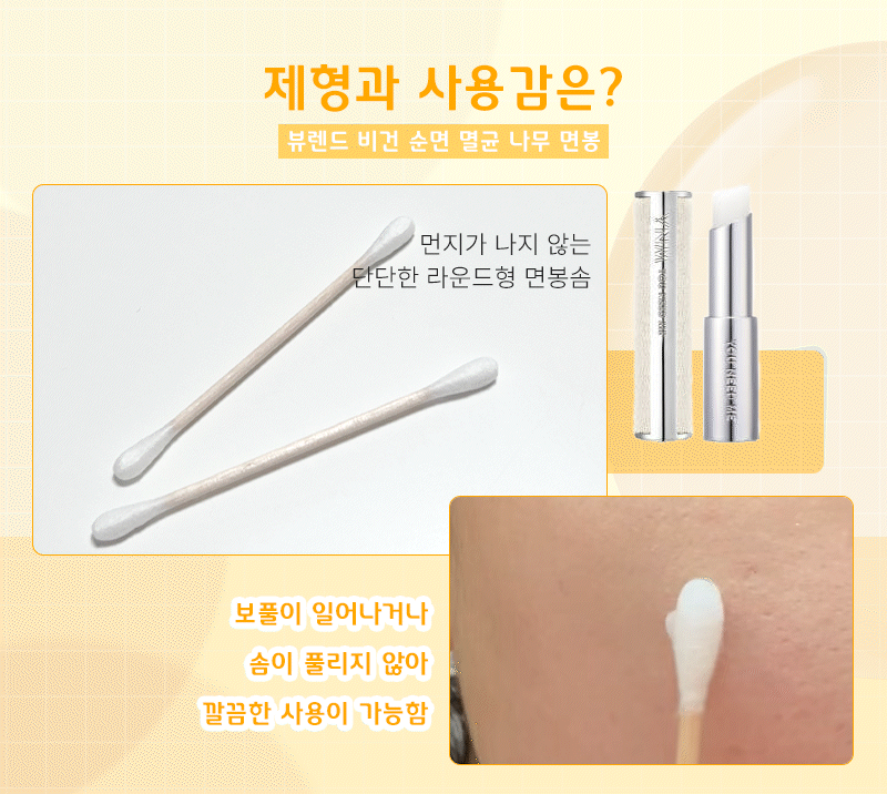 또한 유해 물질이나 세균 등이 없는 안심 비건 면봉이기 때문에 상처난 부위에 연고를 바르거나, 입술처럼 민감한 부위에 립밤을 바를 때 활용하기에도 좋은 화장품 추천 아이템이다.
