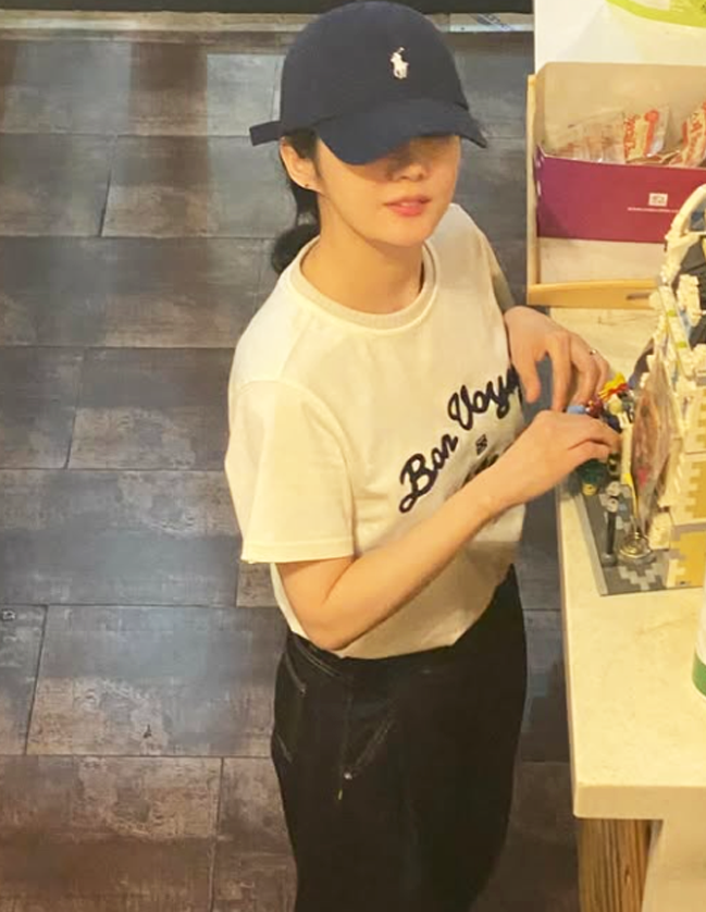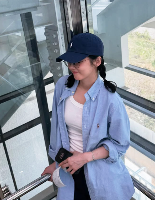 루즈핏 체크 셔츠는 편안함 속에 세련미를 더하며, 그녀 특유의 '꾸안꾸' 스타일을 완성했다.