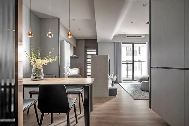 집의 첫인상을 좌우하는 현관은 단순히 지나치는 곳이 아니다. 회색톤의 패브릭 러그와 세로로 세워진 티타늄 금속 프레임이 어우러진 반투명 롱홍 유리 파티션이 처음부터 눈길을 끈다.