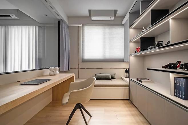 서재는 단순한 업무 공간을 넘어선다. 카메라 수집가인 주인을 위한 오픈형 선반과 곡선 마감의 책상이 실용성과 디자인을 동시에 만족시킨다.