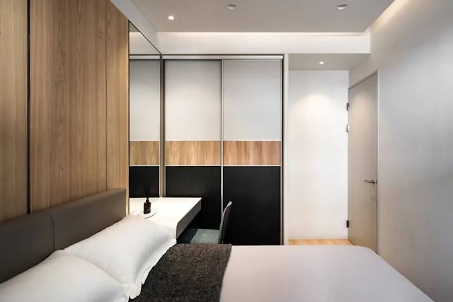 부모를 위한 방은 세심한 배려로 가득하다. 티타늄 유리 파티션으로 살짝 구분된 공간에, 두 개의 독립된 침대 사이에는 각도 조절이 가능한 조명과 코너형 수납장이 있어 서로의 수면을 방해하지 않으면서도 활용도를 높였다. 침대 옆 벽면 수납장 하단에는 약이나 티 등을 보관할 수 있는 서랍 겸 찻장이 프리셋으로 마련되어 있다.