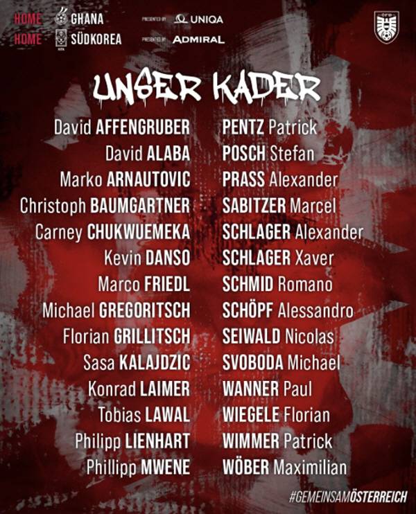 귀화 선수도 뽑았다. 잉글랜드 청소년 대표를 지낸 공격수 카니 추쿠에메카(도르트문트)가 이번 달 처음으로 오스트리아 대표팀에 발탁됐다. 추쿠에메카는 유망주 시절 첼시에서 뛴 경험이 있다. 독일 이중국적자 파울 바너(에인트호번)도 오스트리아 대표팀을 택했다.